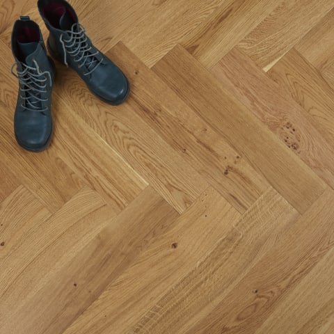 £65.29 per m2 Pack Price: £42.44 inc vat Pack Size: 0.65m2Natural Oiled Oak Herringbone Rustic Engineered Parquet Click Block