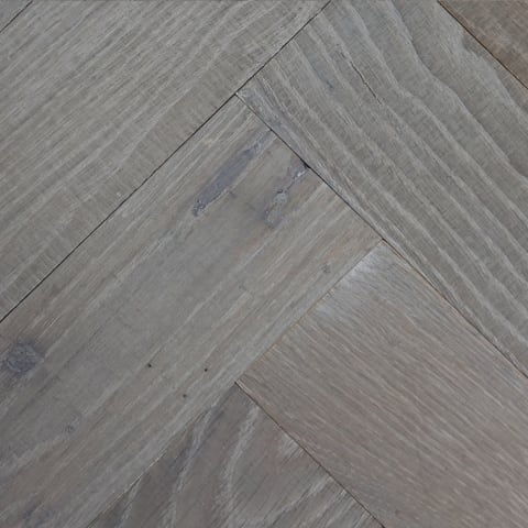 £189.46 per m2 Pack Price: £189.46 inc vat Pack Size: 1m2Farmhouse Grey Oak Hardwax Oiled Reclaimed Herringbone Parquet Engineered Hardwood Flooring