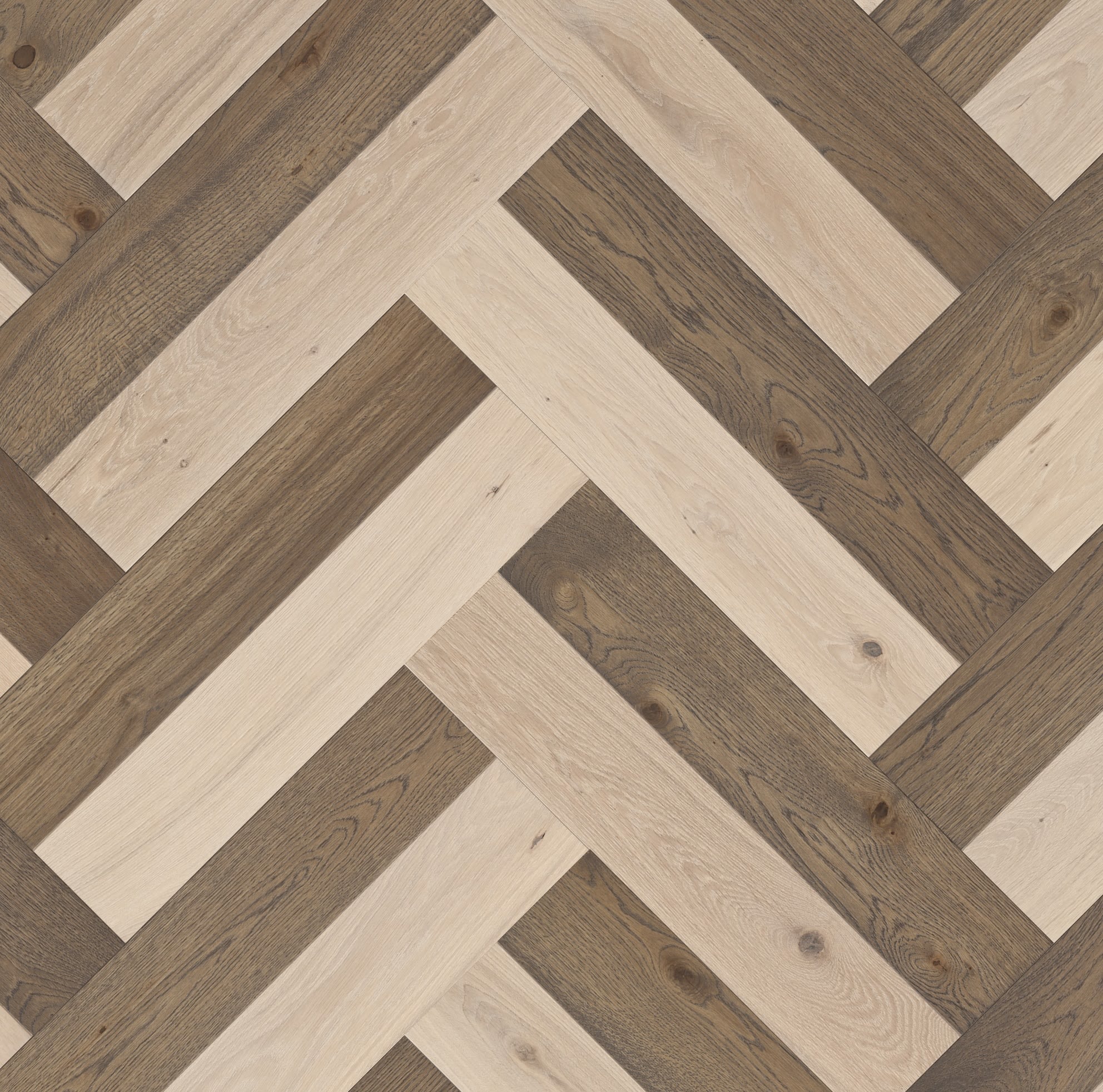 VPQ122 Chartres Double Oak Herringbone – Old Grey + Lime – Brushed engineered block is more than just a traditional herringbone design with a twist of double block with two opposing tones creating a very unique looking floor with a creative twist on parquet block flooring which does not fail to impress. The laying of Double Blocks are set two on then two off which creates a T-shape pattern within the Double Herringbone block pattern which can be seen in the images.