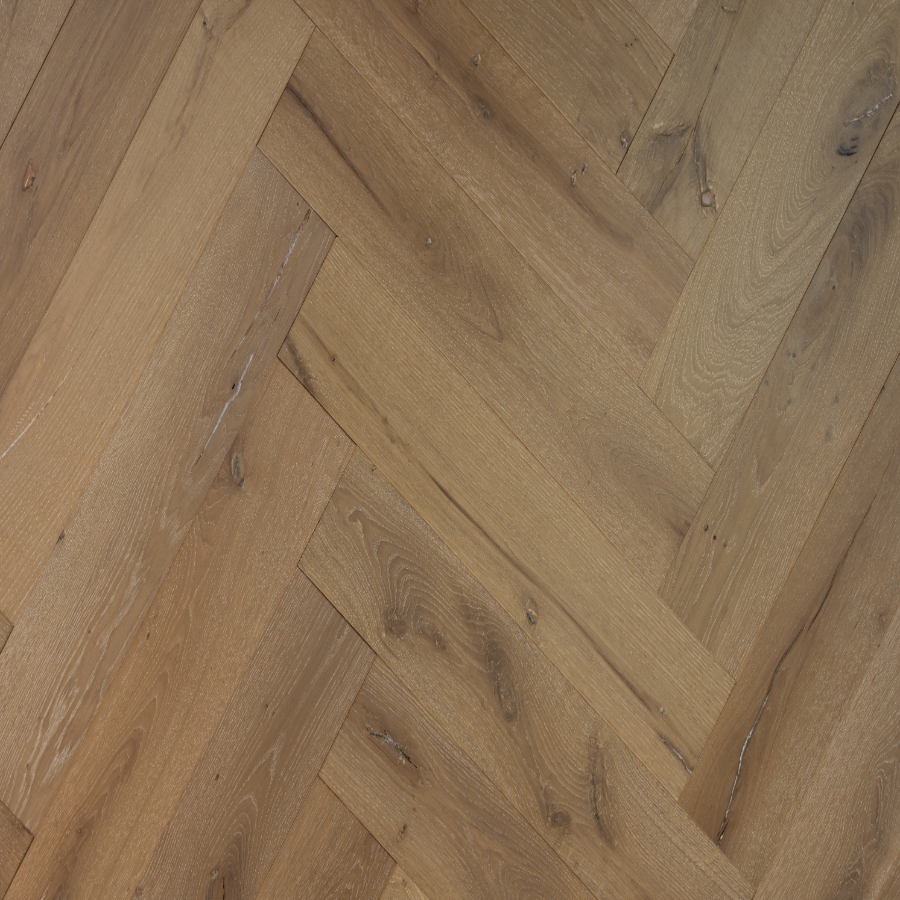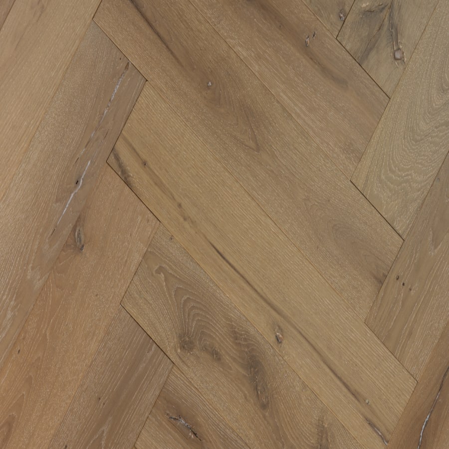 The VPQ137 Edinburgh Rustic Oak Brushed & Matt Lacquered Engineered Herringbone Floor has been created as one of a range of Hand worked Antique Engineered Oak floors created with timeless elegance that will elevate any interior and exudes warmth and sophistication. Each plank is expertly engineered for enhanced durability and stability, making it ideal for both modern and traditional spaces. With lightly open splits, enhanced knots and a rustic texture, its gives an authentic aged appearance. The superior craftsmanship on this Edinburgh rustic oak herringbone floor means it is the perfect choice for those seeking a luxurious yet practical flooring solution.