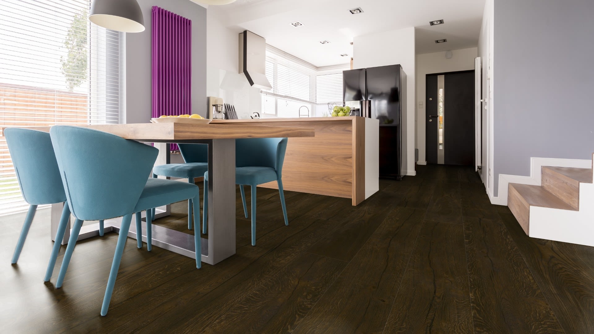 The Farmyard Oak darker in appearance with a deep brushed grain in dark stained oak, each individual plank is hand finished with filled long and deep knots on an engineered hardwood to deliver a truly rustic feel of a floor you would find in a barn conversion and comes with a Lifetime Structural Guarantee.