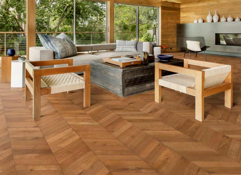 The VPQ030LR Light Brown Oiled Vintage Chevron Oak oozes style and class, strips of light brown oiled oak with a vintage appearance are used in a Chevron pattern in a formation of left planks and right planks to give a very distinctive and exclusive look that delivers class and hints the art European parquet from buildings of grandeur and opulence.