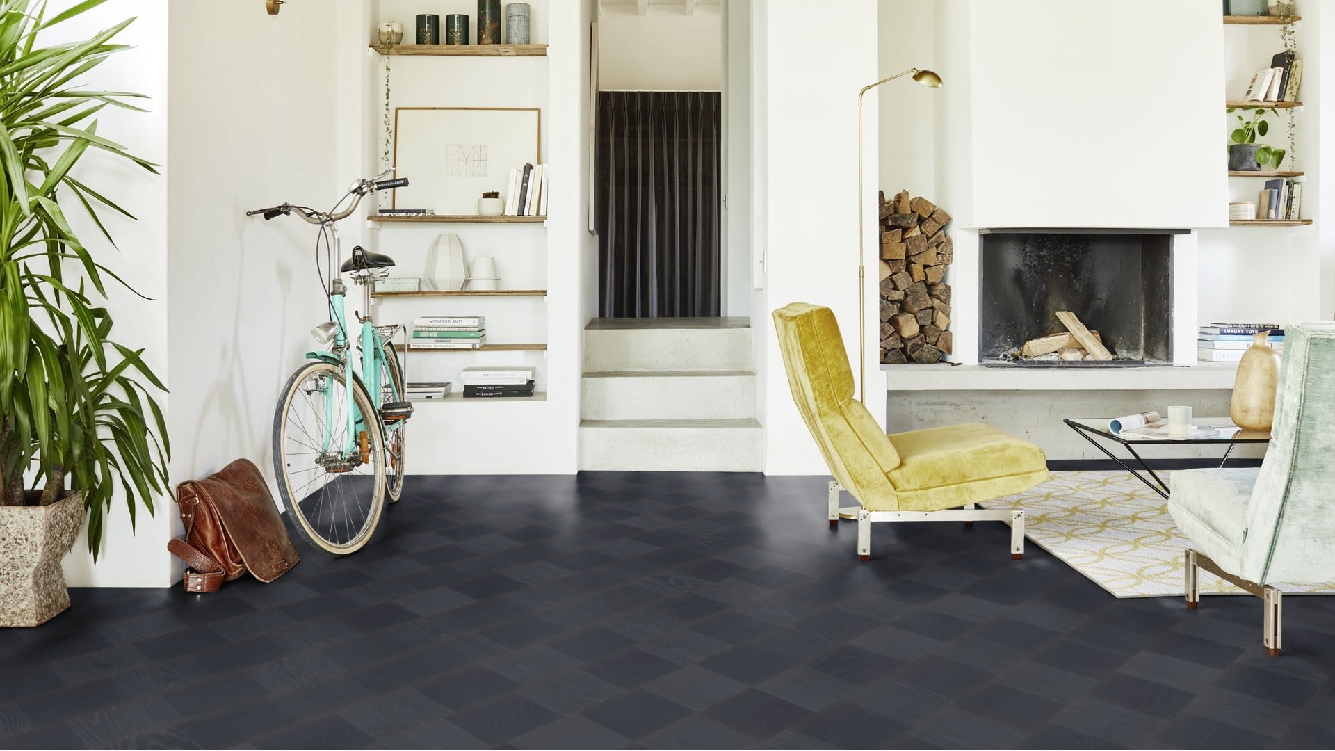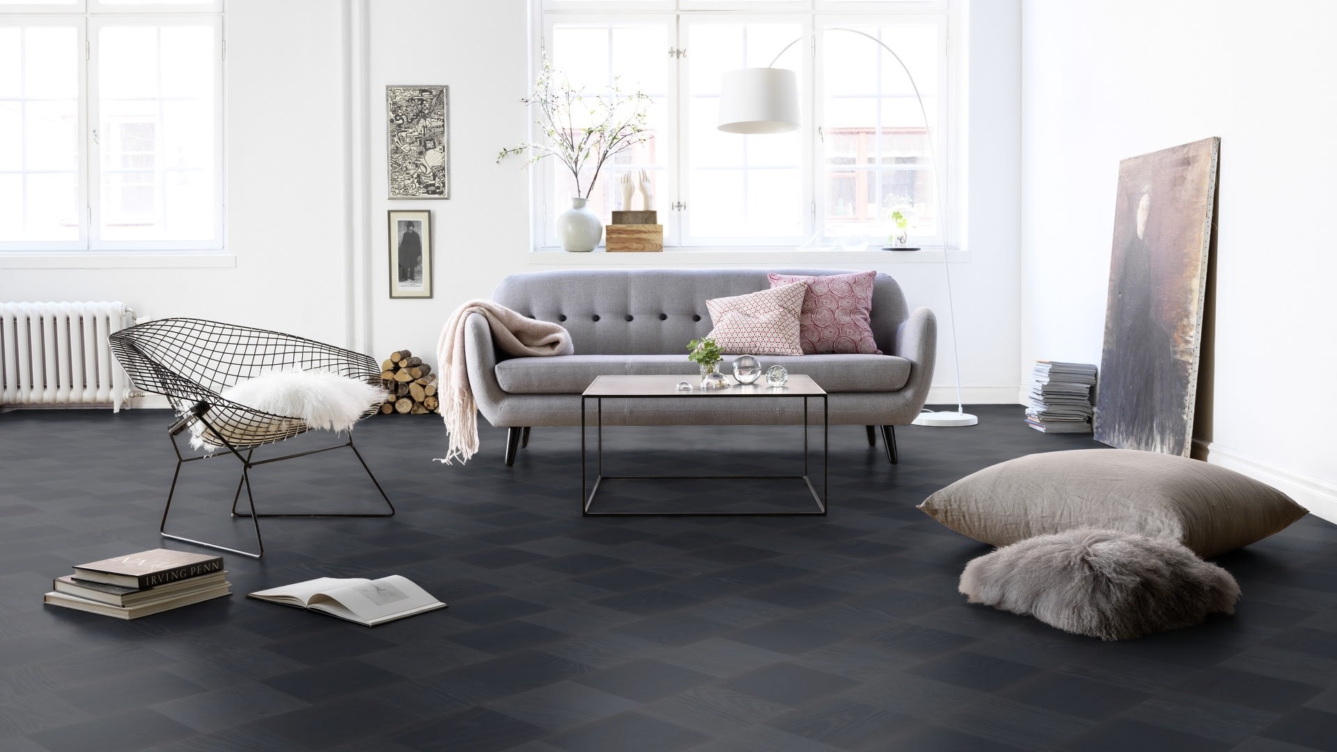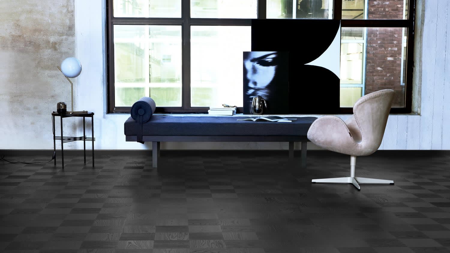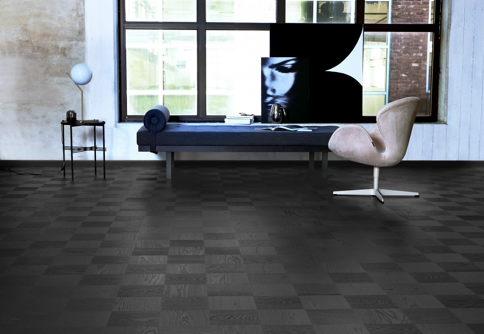 VPQ105 Milan Stained Oak Grande Cube block parquet applies a unique checker board arranged cube pattern where each square panel is set side by side with direction of grains in opposite directions in two lines creating a single plank making a very distinctive mosaic style board that is Hardwax oiled adding a natural textured grain.