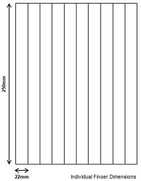 - 14mm x 22mm x 250mm (per finger)