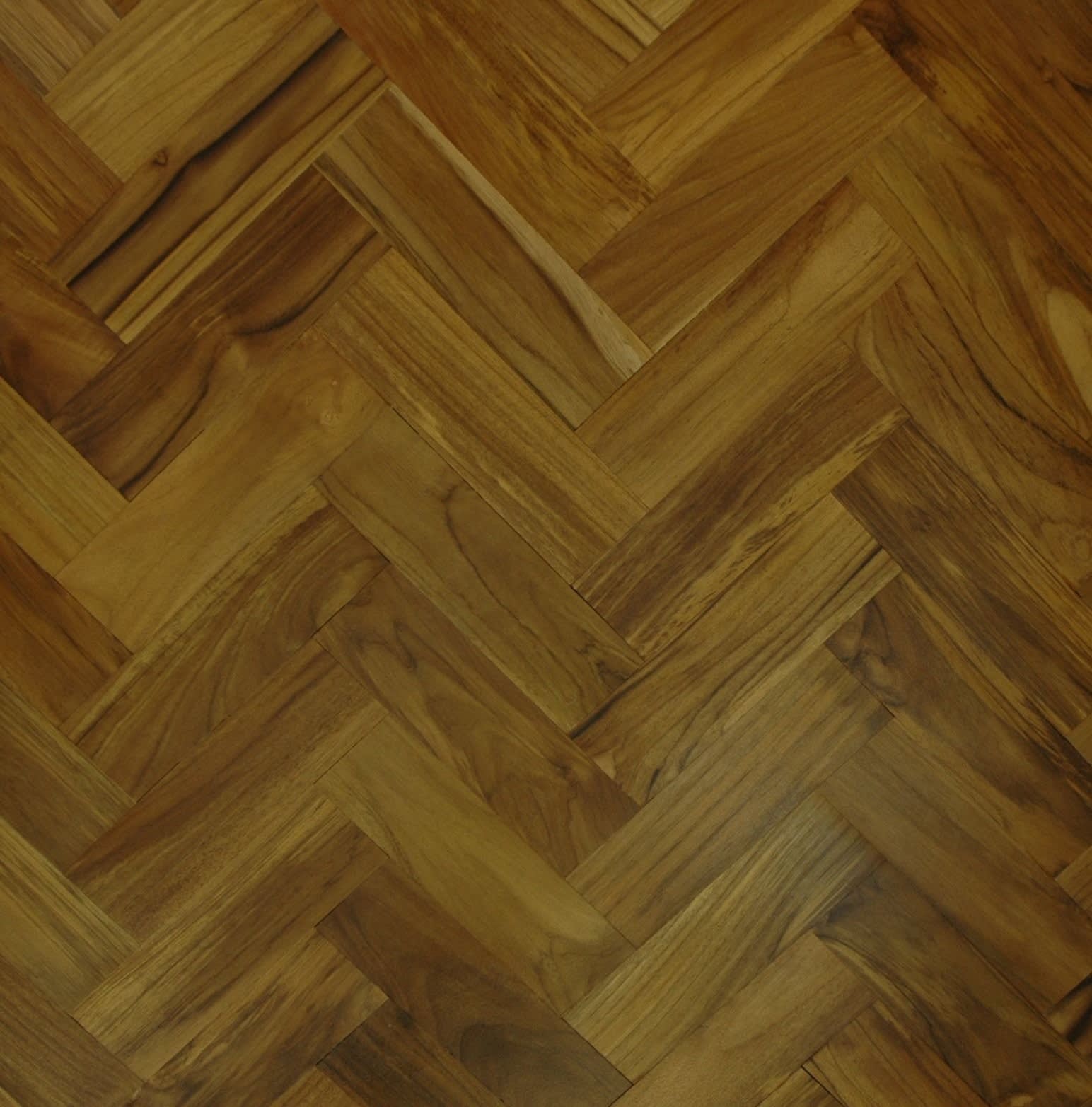 PQT009-A Teak Natural 280mm Parquet Block – Herringbone is unfinished. It is both rich and distinctive, the texture, natural character and grain of the wood with dark flecks which are enhanced once either oiled or lacquered.