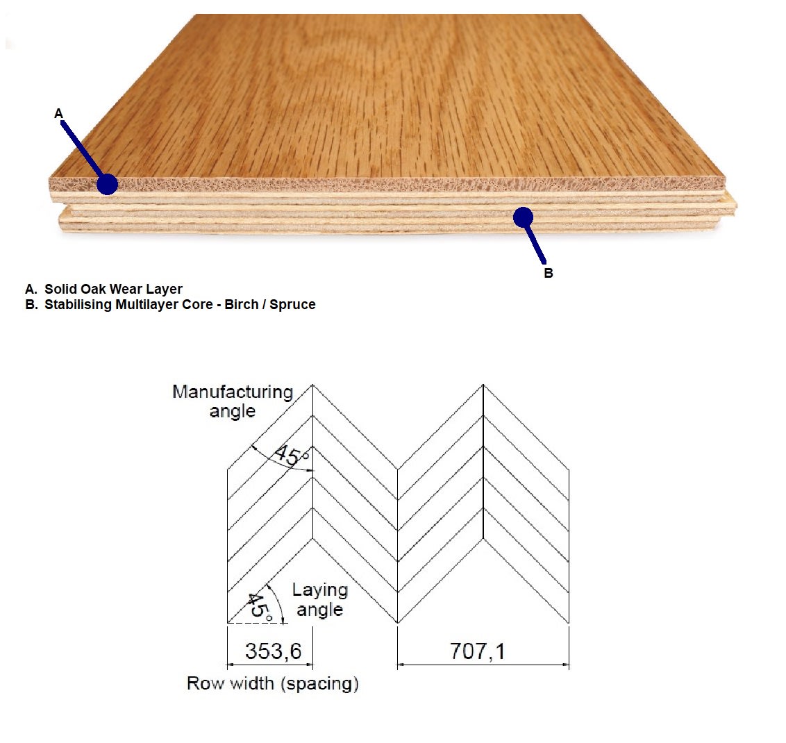 The VPQ130 Treviso Stained Oak Brushed & UV Oiled oozes style and class, strips of stained oak are used in a Chevron pattern in a formation of left planks and right planks to give a very distinctive and exclusive look that delivers class and hints the art European parquet from buildings of grandeur and opulence.