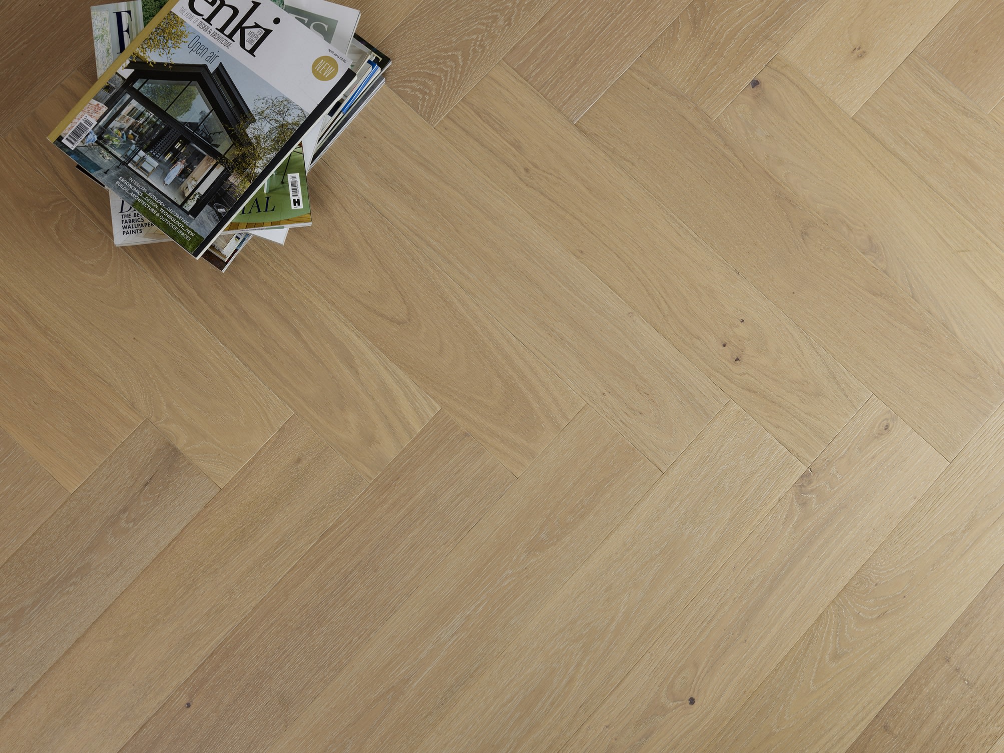 The White Natural Oak Oiled Herringbone delivers the classic herringbone parquet with a natural look in a natural oil which enhances the grain after being subtly stained in a trending white finish, each block is milled with a micro-bevel to optimise the parquet pattern.