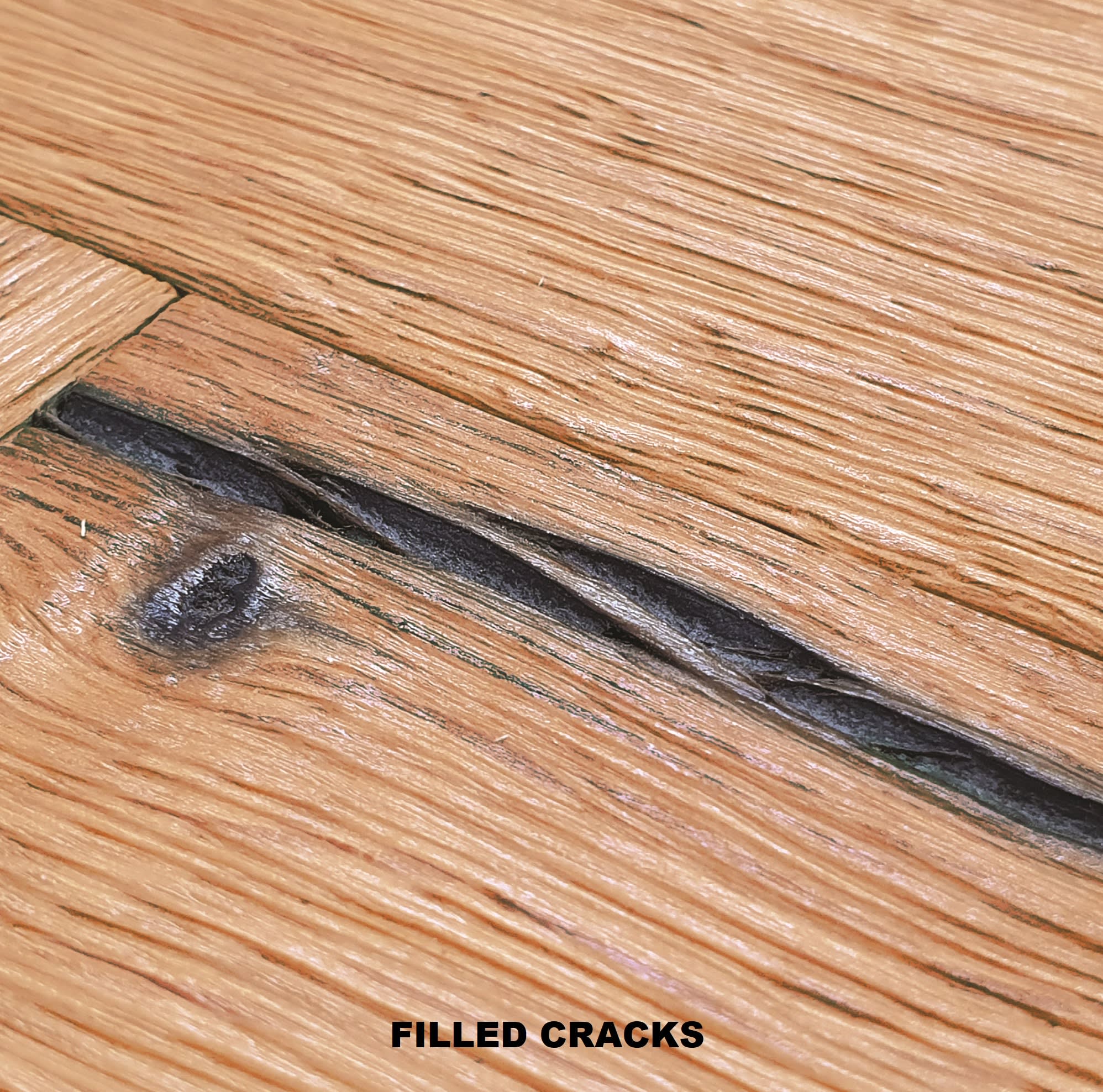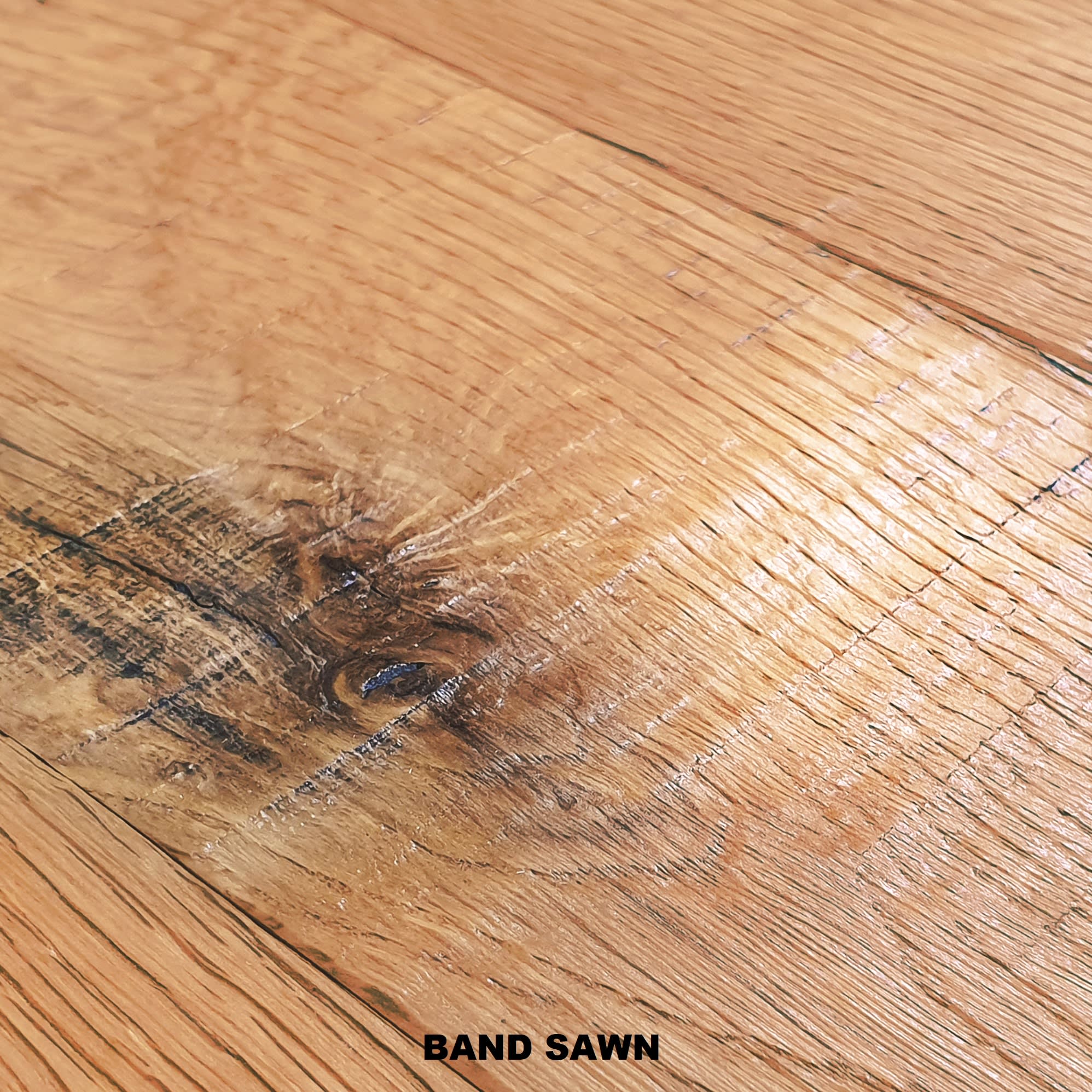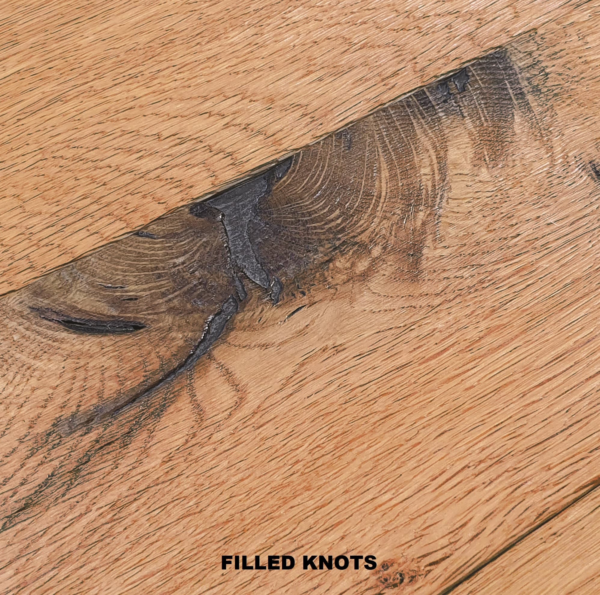 This reclaimed oak is sourced from old beams from old buildings from France and Germany of which boards are varied in texture which includes natural distressing, original worm holes, sawn texture, splits and knots that have been filled and then crafted on a engineered board by artisans here in the UK.